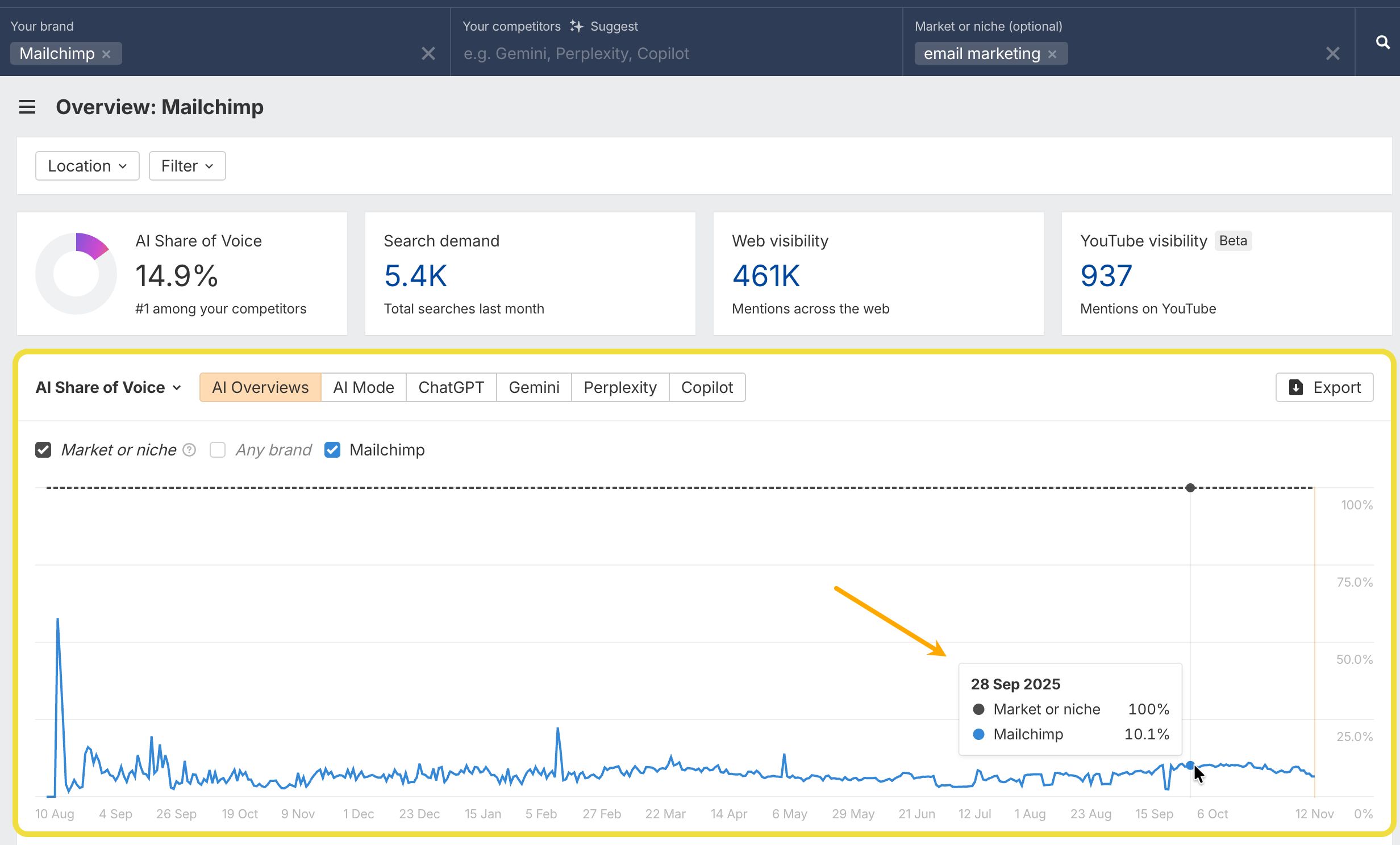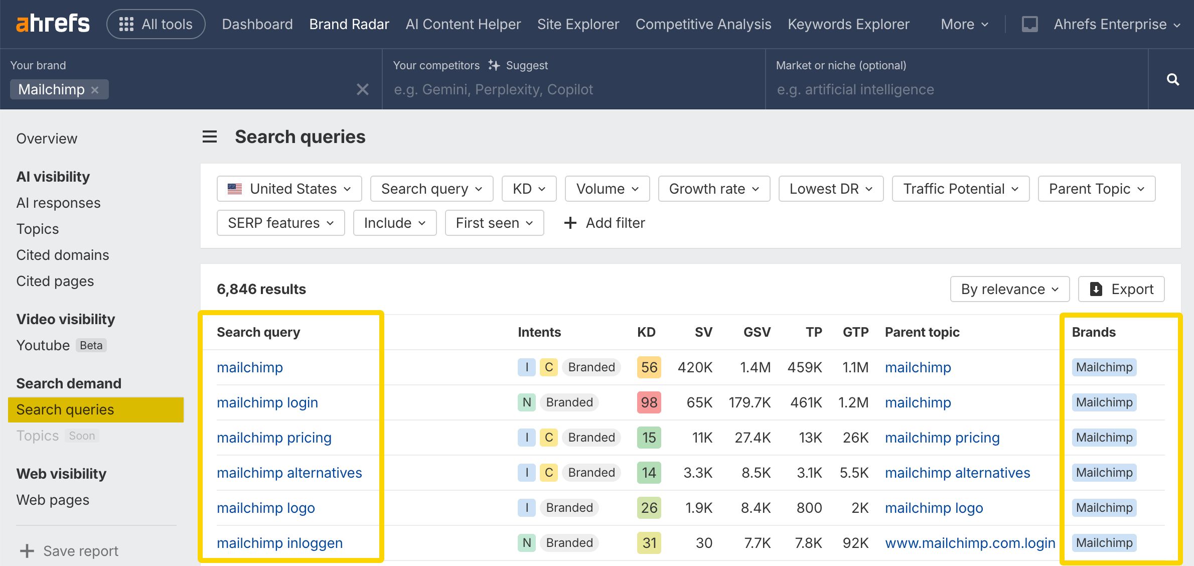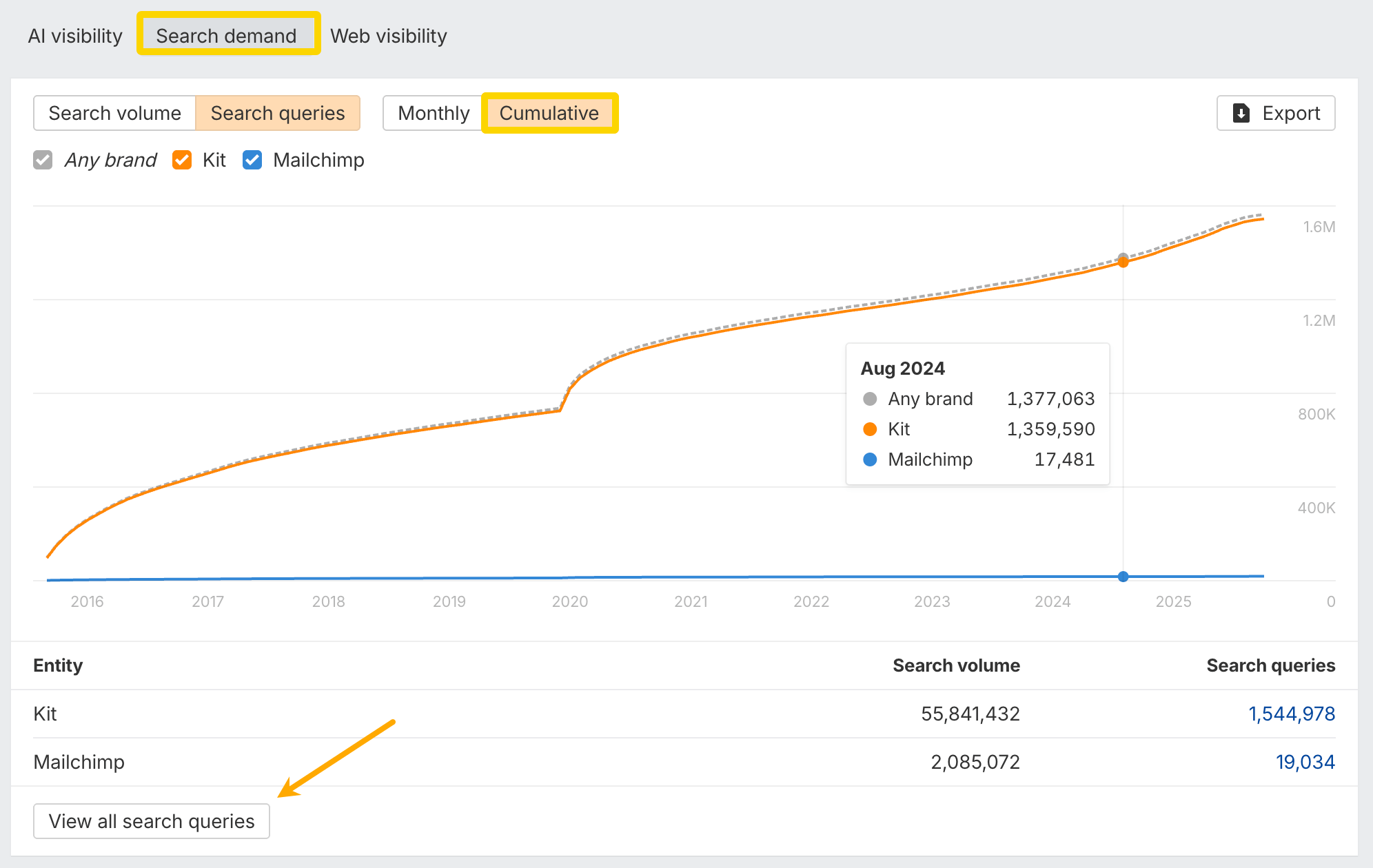That’s why Ahrefs Brand Radar gives you insights into your brand’s search demand: the sum of all the search volumes from the keywords mentioning your brand (in Google).