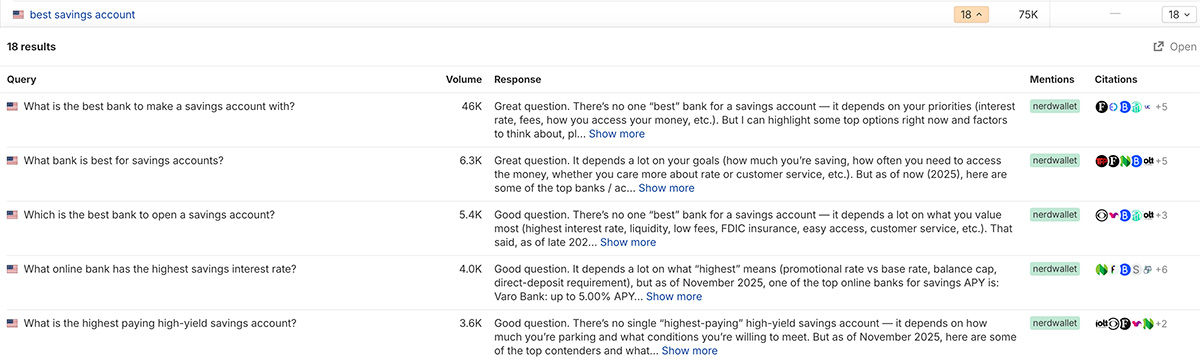 When researching industries I’m less familiar with, I’ll often take these questions as-is to see which brands, domains, and response types appear most often over time.