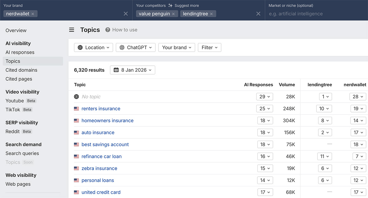 Looking at visibility for the finance platform NerdWallet, we can see it’s already associated with topics like ‘homeowners insurance’ and ‘best savings account’.