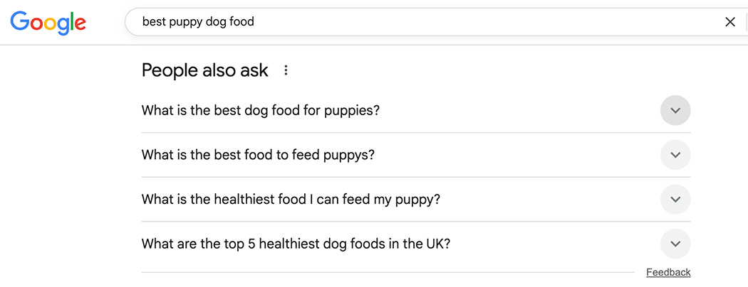 If you’re in the pet niche, a simple search for the ‘best food for puppies’ instantly returns suggestions of related and potential follow-up questions: