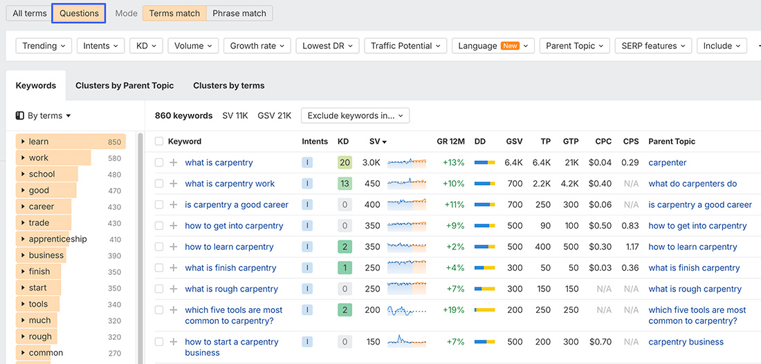 If your site is new, doesn’t get much search traffic yet, or you’re simply researching another industry, you can also use the same terms in a filter of Ahrefs’ Keywords Explorer tool.