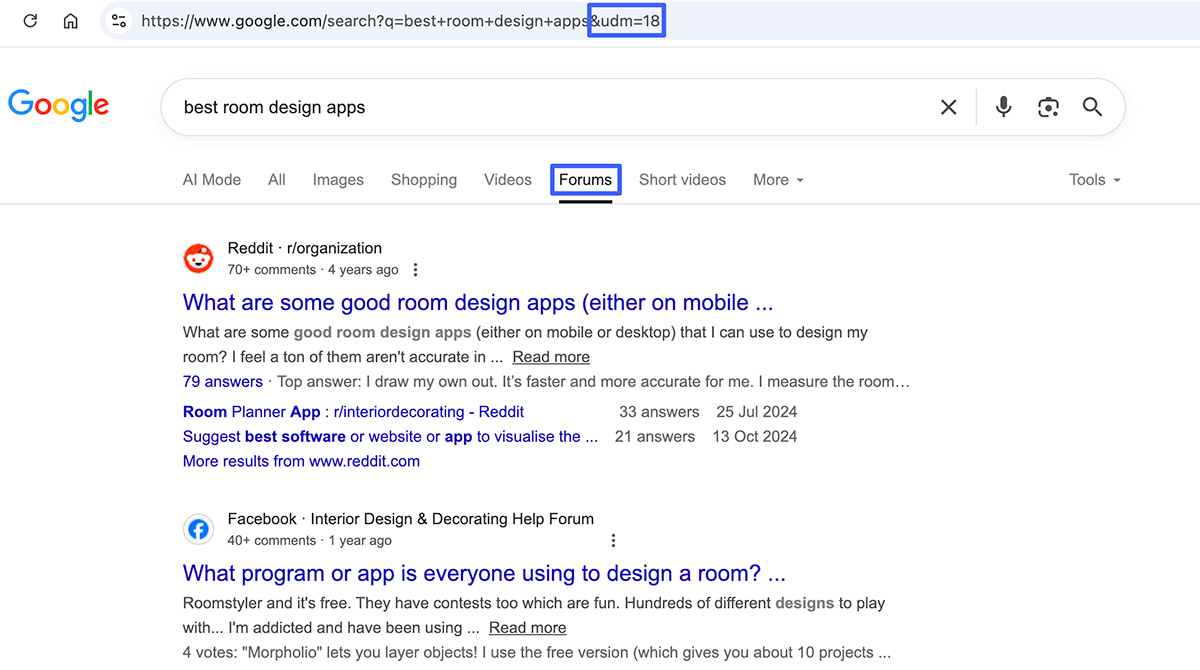There’s a specific parameter you can add to your address bar, &udm=18, which allows you to directly search forums around your topic instead of simply hoping the SERP feature will show up in results.