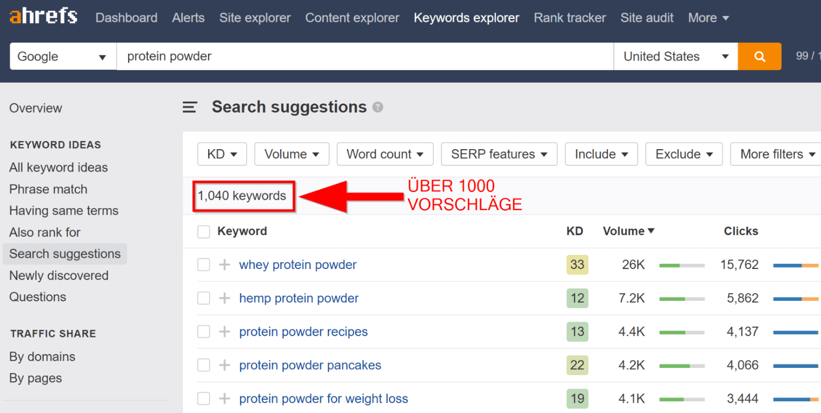Ich zeige Ihnen das am Beispiel von “protein powder” im Ahrefs Keywords Explorer: