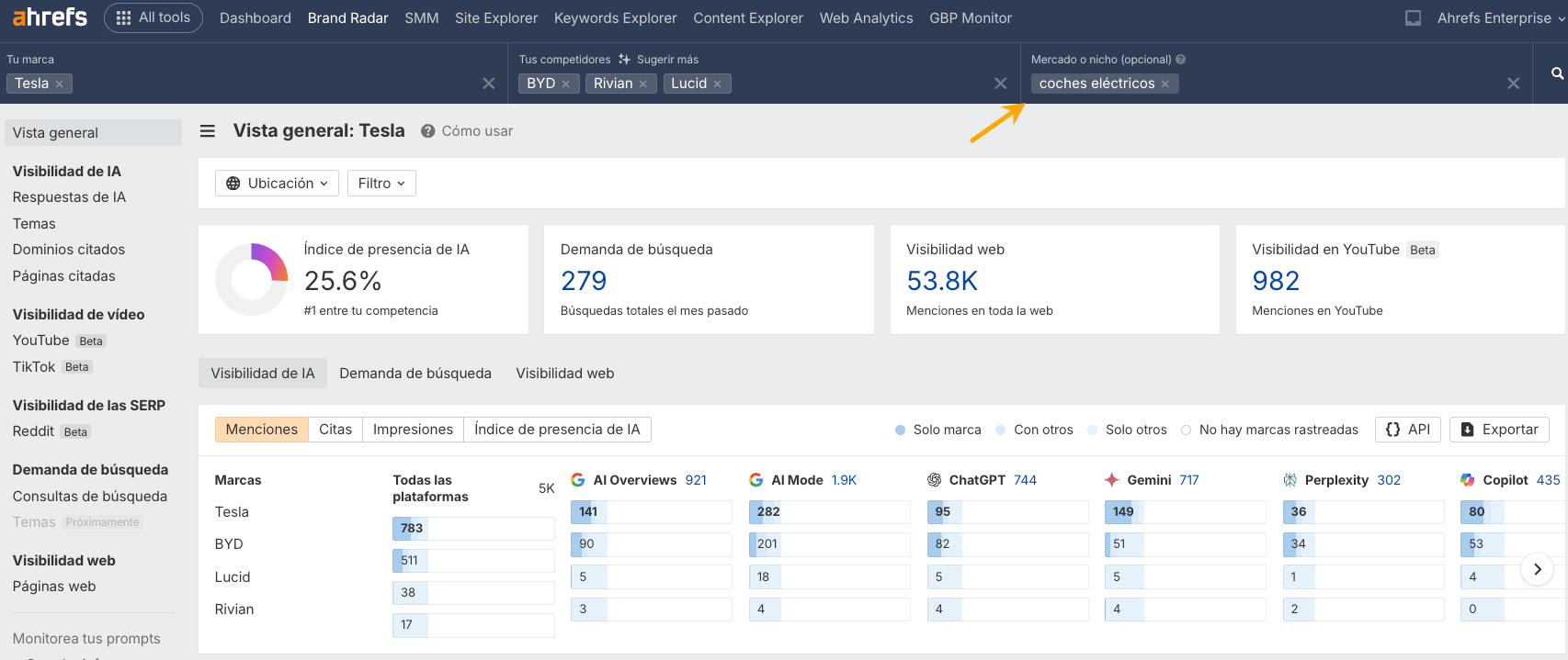 La solución es usar Brand Radar para ver qué tal te va a ti y a tus rivales en los LLMs.