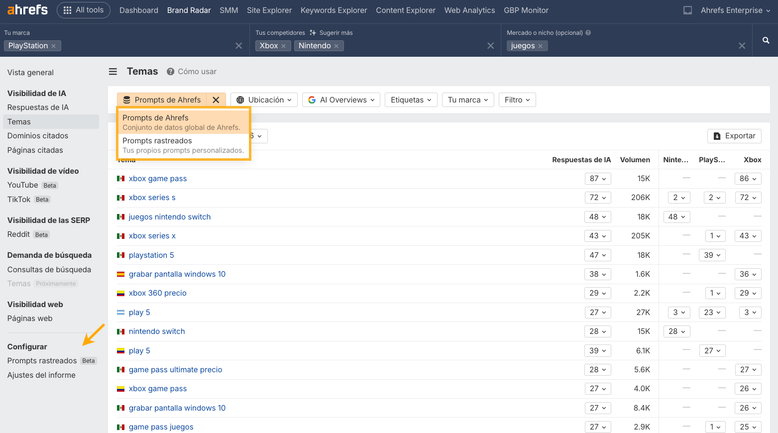 Ahrefs te deja analizar prompts que tú elijas. Tú decides qué quieres investigar: