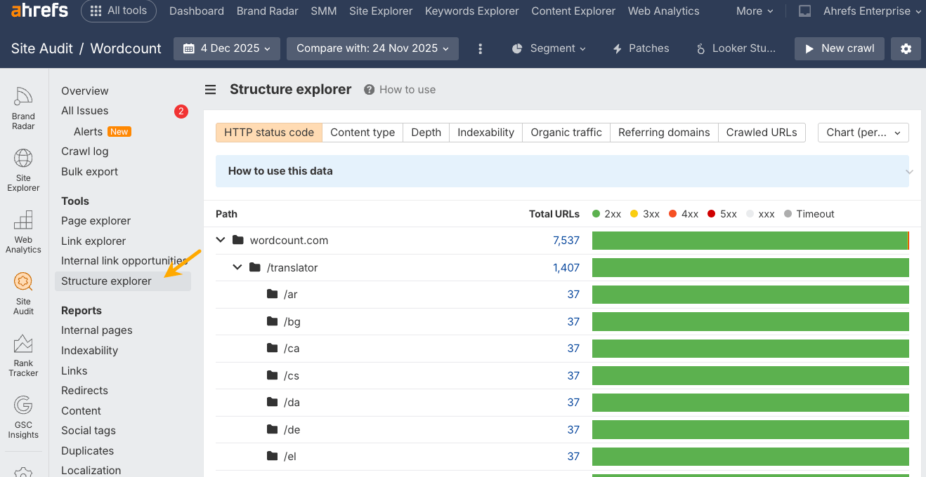Tener una arquitectura común hace que las migraciones sean seguras, los lanzamientos más fáciles y que todo tenga sentido a nivel global, pero dejando que los equipos locales puedan usarlo. Herramientas como Site Audit de Ahrefs vienen genial para revisar la estructura del sitio.