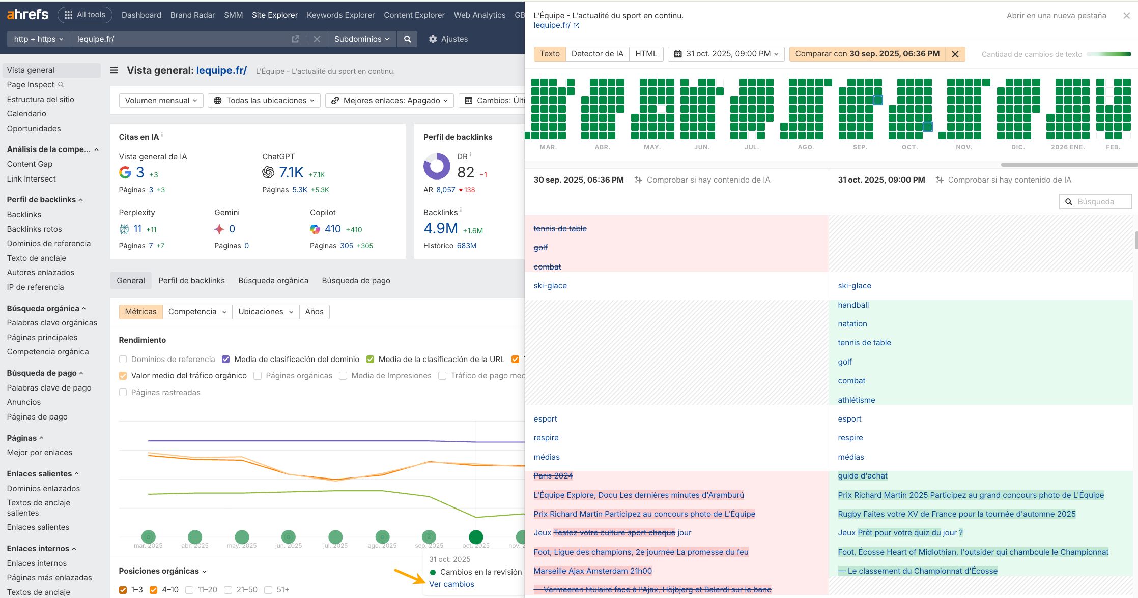 Por ejemplo, en la web de L’Équipe, Site Explorer nos marcó una bajada de golpe justo cuando hubo un cambio gordo (el círculo verde):