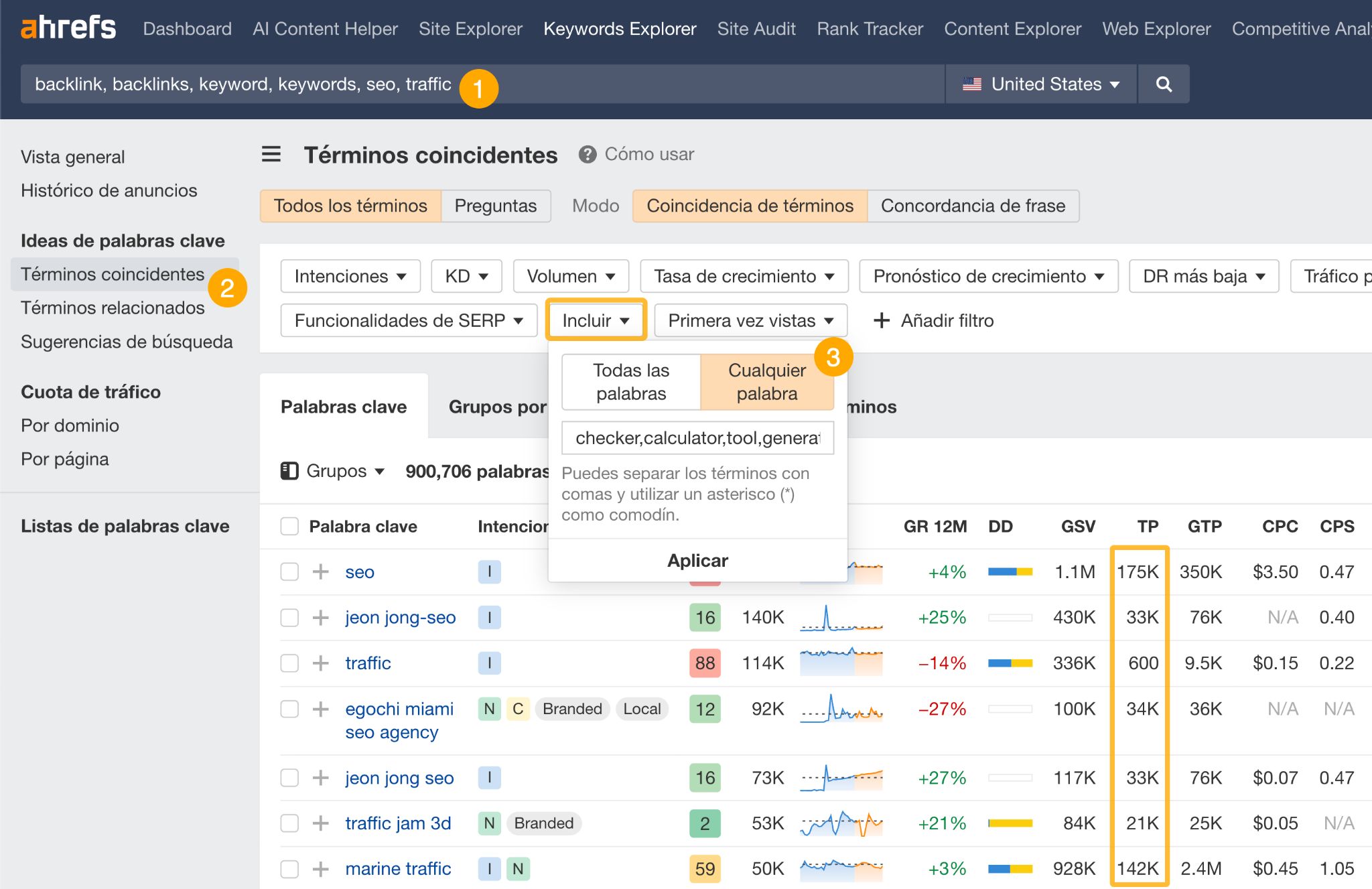 - Ingresa algunas palabras clave amplias relacionadas con tu negocio (por ejemplo, backlinks, palabras clave, seo, tráfico).