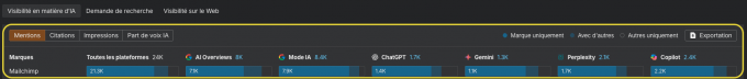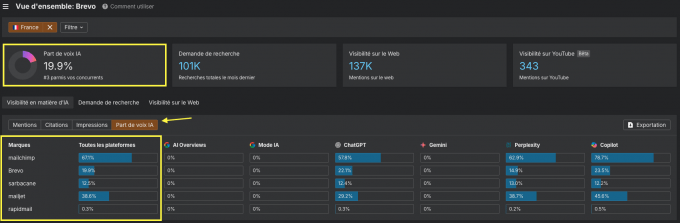 Intéressez-vous particulièrement l’AI Share of Voice (SOV) : à quel point les plateformes IA citent votre marque par rapport aux autres marques de votre marché.
