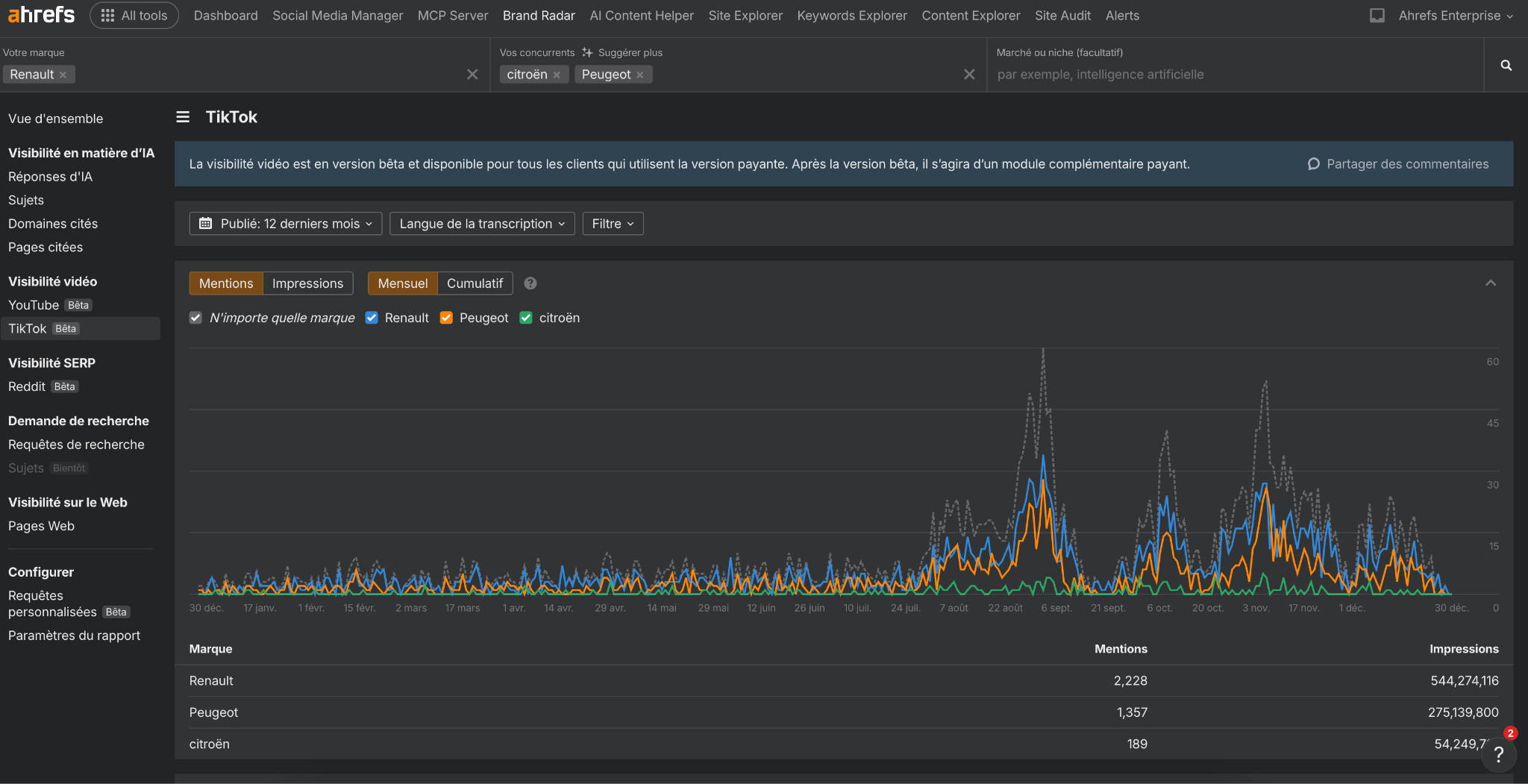 Brand Radar inclut désor­mais Tik­Tok. La sec­tion Vis­i­bil­ité vidéo cou­vrait déjà YouTube, et Tik­Tok vient main­tenant s’y ajouter. Vous pou­vez ain­si voir où votre mar­que appa­raît dans des vidéos à fort trafic.