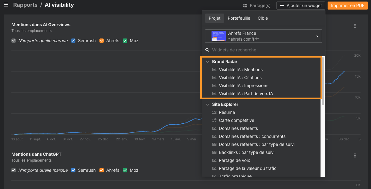 Les wid­gets Brand Radar pren­nent désor­mais en charge davan­tage d’indicateurs de vis­i­bil­ité IA, notam­ment les Cita­tions, les Impres­sions et la Part de Voix IA, et plus seule­ment les Mentions.