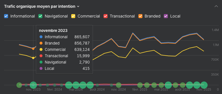 Cela sig­ni­fie que vous ne voyez plus seule­ment où les mots-clés se posi­tion­nent, mais aus­si si ces inten­tions génèrent réelle­ment des visites.