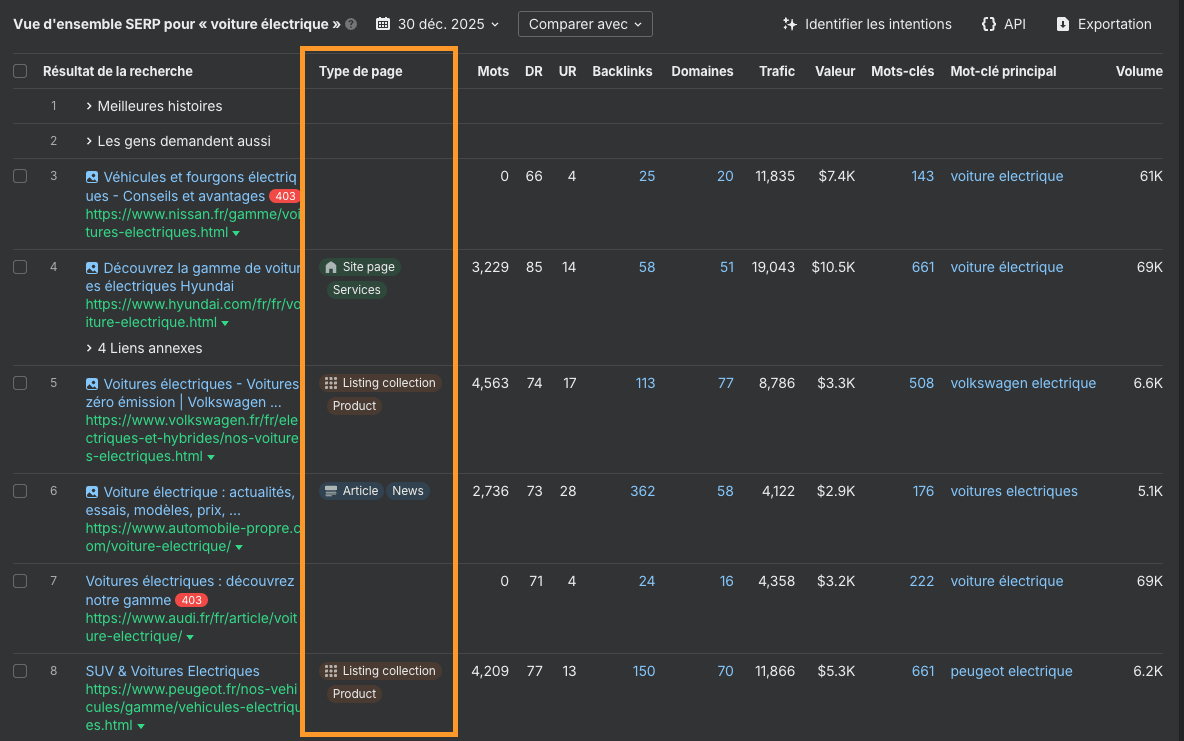 Grâce à l’IA, nous clas­sons le type de con­tenu qui se posi­tionne, comme les arti­cles, les pages de des­ti­na­tion ou les out­ils, avec des sous-types tels que guides pra­tiques, lis­ti­cles ou pages pro­duit. Cela per­met de com­pren­dre en un coup d’œil ce que Google val­orise pour une SERP donnée.