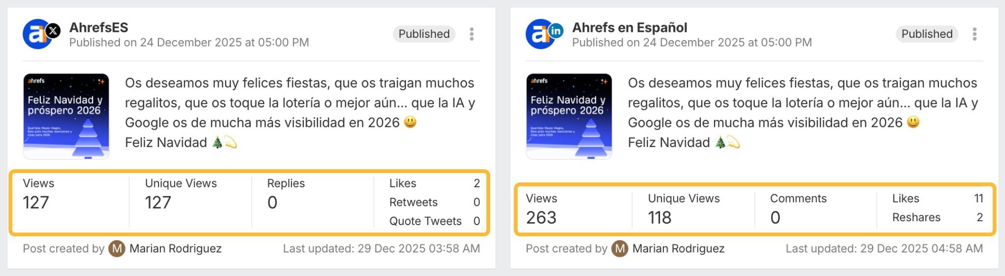 Chaque post pub­lié affiche des indi­ca­teurs d’engagement comme les vues, les réac­tions et des sig­naux spé­ci­fiques à chaque canal, le tout en un seul endroit.