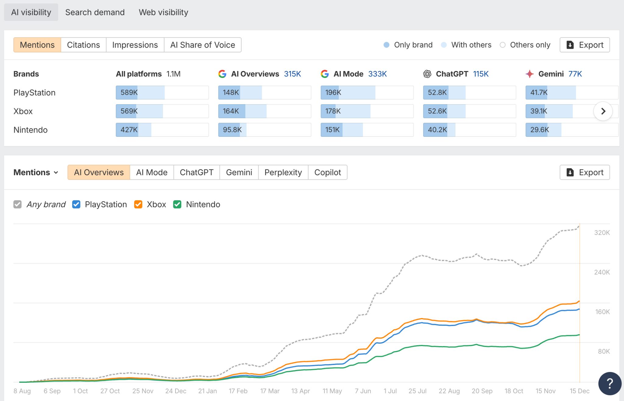 Nous avons ajouté de nou­veaux end­points à l’API Brand Radar, notam­ment la dis­tri­b­u­tion des Men­tions par client IA et des don­nées tem­porelles pour les Men­tions et les Impres­sions, avec les mêmes fil­tres que dans l’interface.