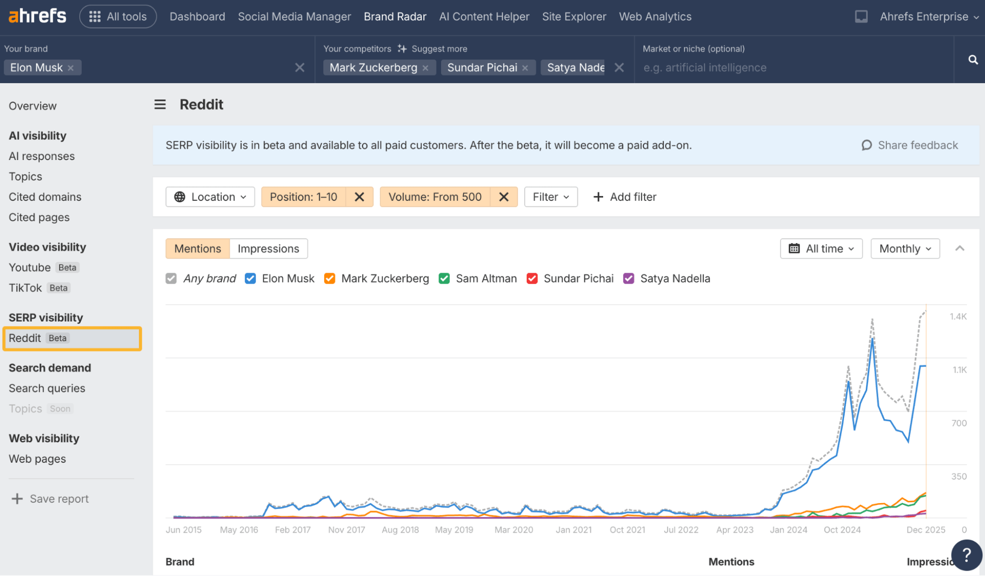Nous avons ajouté un nou­v­el index Red­dit dans les SERP qui mon­tre à quel point votre mar­que est vis­i­ble dans les résul­tats Red­dit posi­tion­nés sur Google.