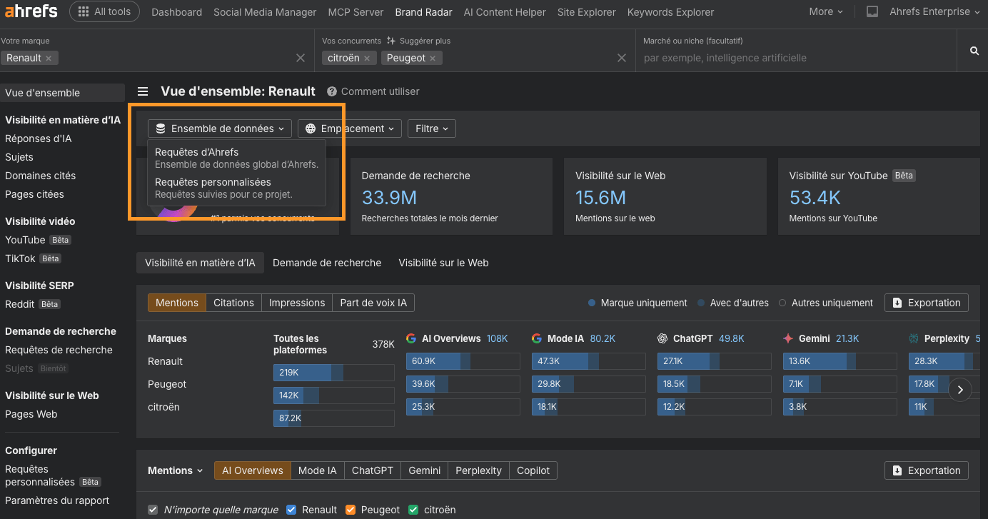 Brand Radar fonc­tionne désor­mais avec deux ensem­bles de don­nées. L’ensemble de don­nées glob­al d’Ahrefs et les requêtes per­son­nal­isées de votre pro­jet. Vous pou­vez con­sul­ter les deux dans un même rap­port ou bas­culer de l’un à l’autre via le nou­veau fil­tre Ensem­ble de don­nées, selon que vous souhaitez une vis­i­bil­ité au niveau du marché ou au niveau des acheteurs.