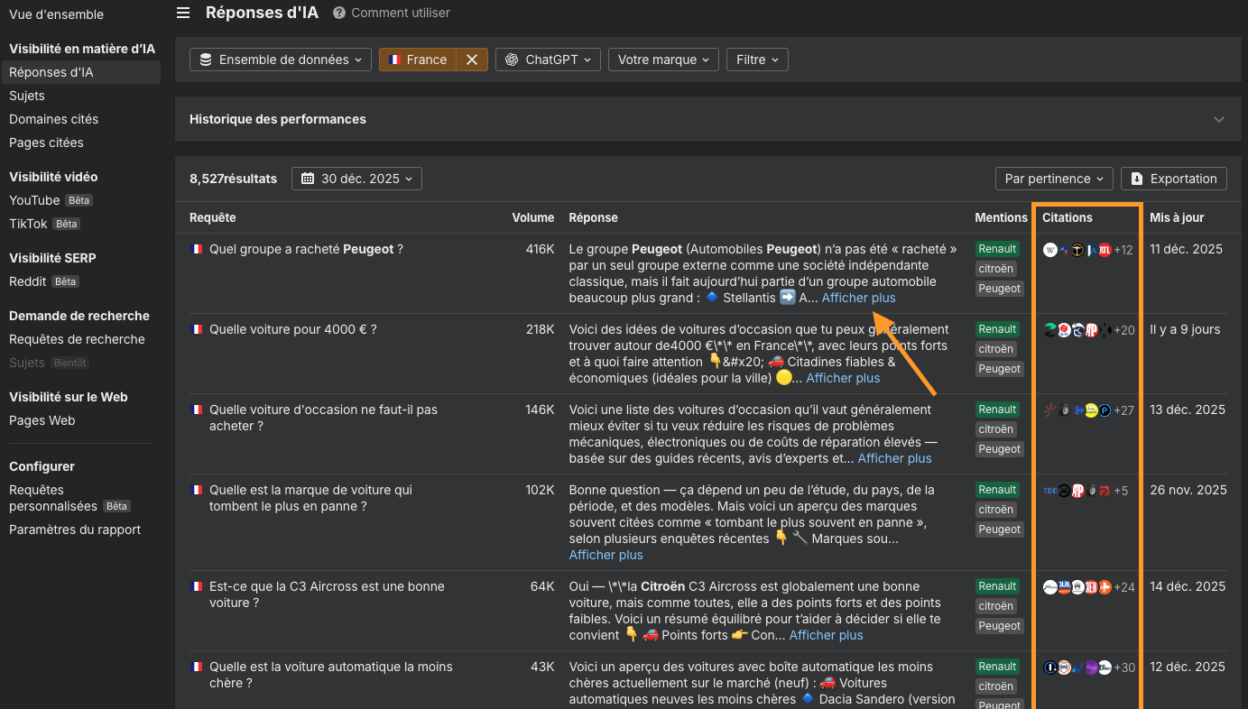 Les longues répons­es IA sont désor­mais repliées par défaut, avec les détails com­plets acces­si­bles dans un pan­neau latéral. Nous avons ajouté des colonnes pour les mar­ques men­tion­nées ain­si que des fav­i­cons pour les sites web cités, ce qui facilite net­te­ment l’identification de ten­dances dans les résultats.