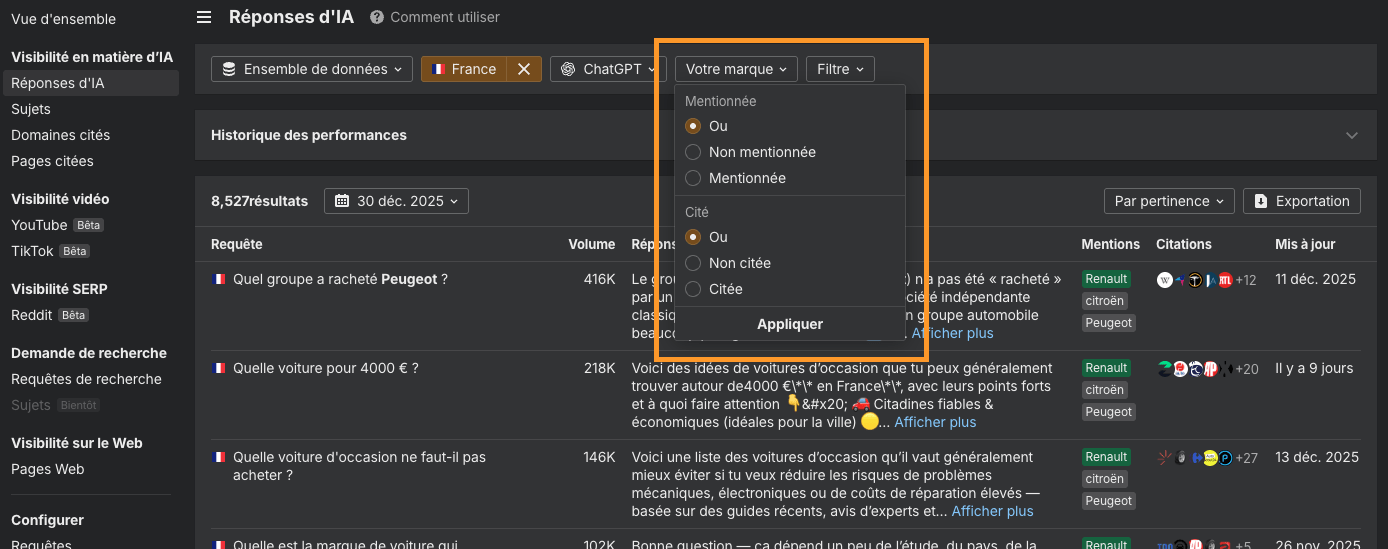 Suivez votre marque sur Reddit et TikTok, requêtes IA personnalisées, et plus encore (décembre 2025)