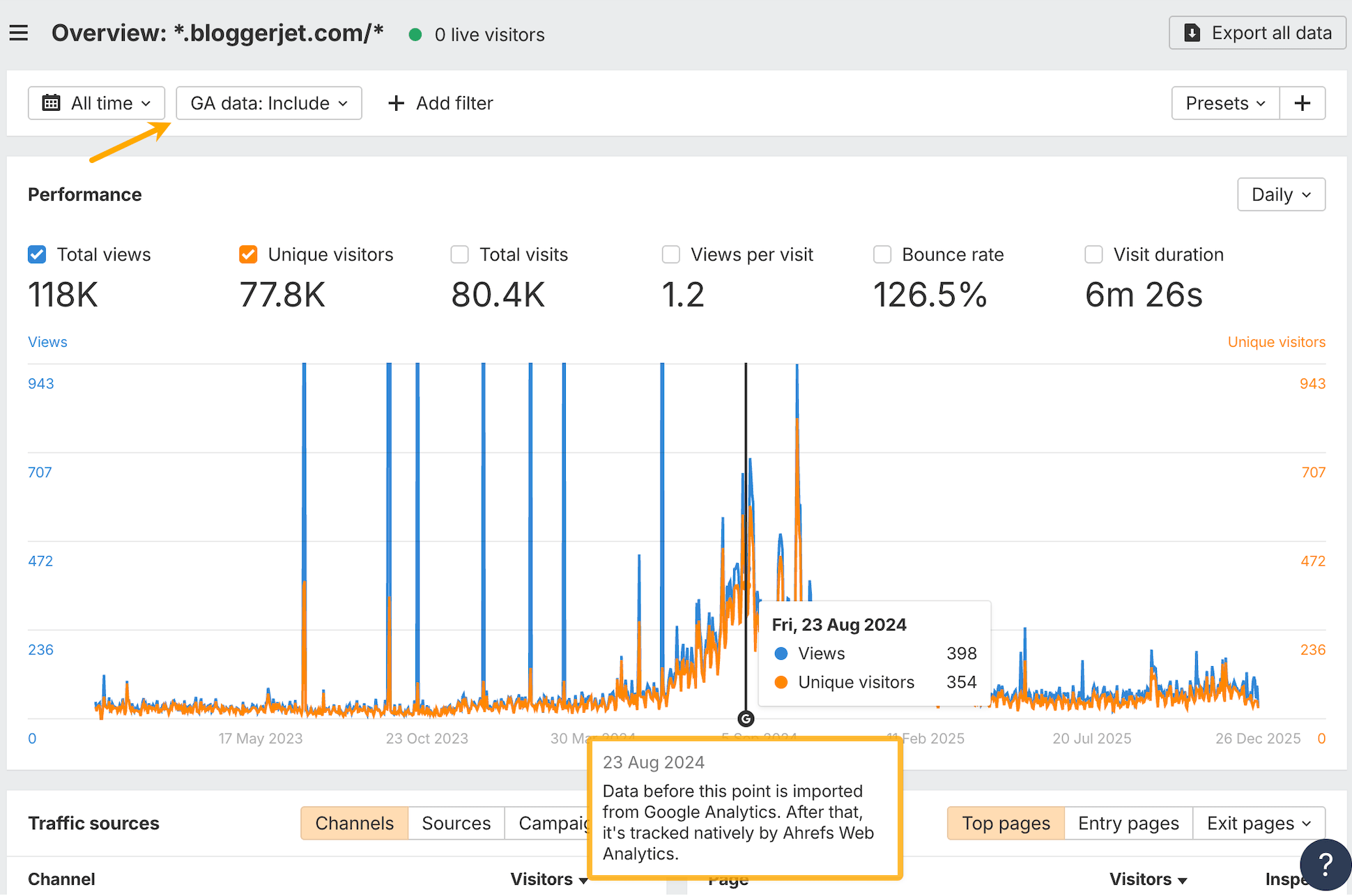 Si votre compte Google est lié à un pro­jet, nous importerons les don­nées passées issues de Google Ana­lyt­ics antérieures au démar­rage du suivi natif de Web Ana­lyt­ics, afin que vos rap­ports ne com­men­cent pas à zéro.