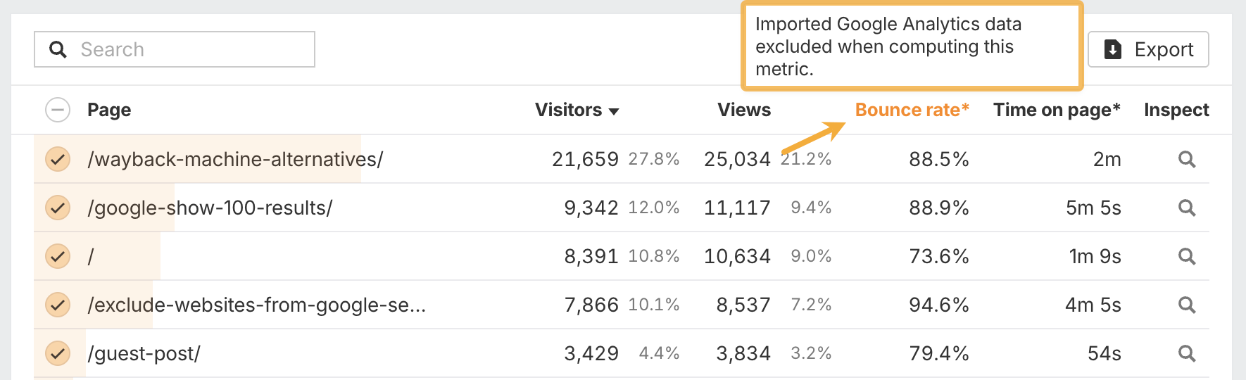 Toutes les métriques Google Ana­lyt­ics ne sont pas pris­es en charge. Les métriques exclues sont claire­ment sig­nalées par un astérisque et une infob­ulle, pour éviter toute mau­vaise surprise.