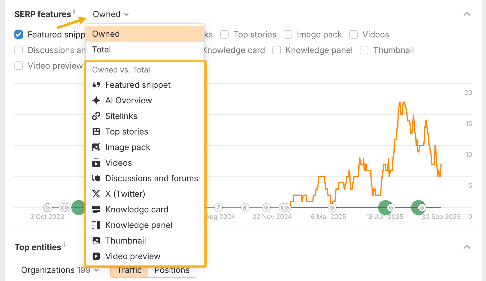 Le graphique est interactif : cliquez sur des features spécifiques, sélectionnez une période, et Organic Keywords s’ouvrira automatiquement avec les bons filtres appliqués.