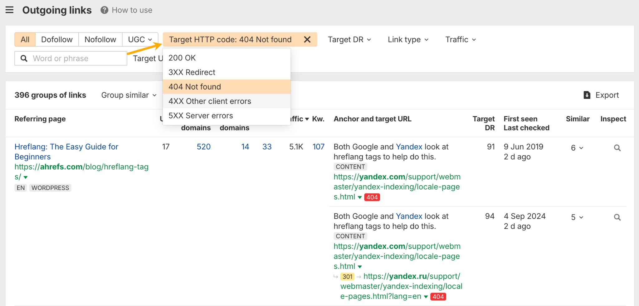 Un nouveau filtre par code statut dans le rapport Liens sortants vous permet de trouver directement les liens sortants cassés.