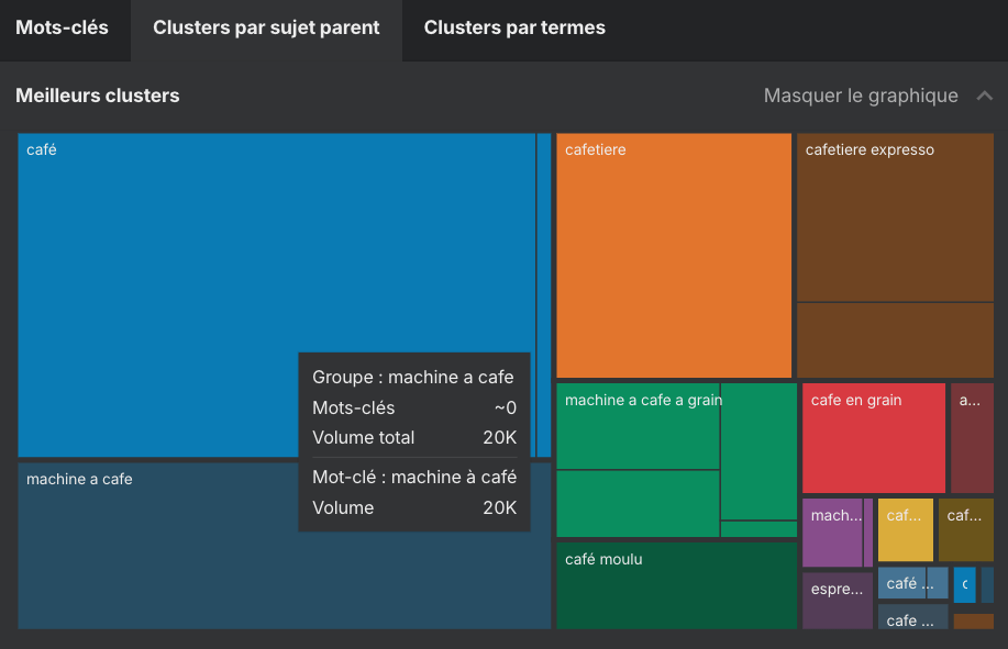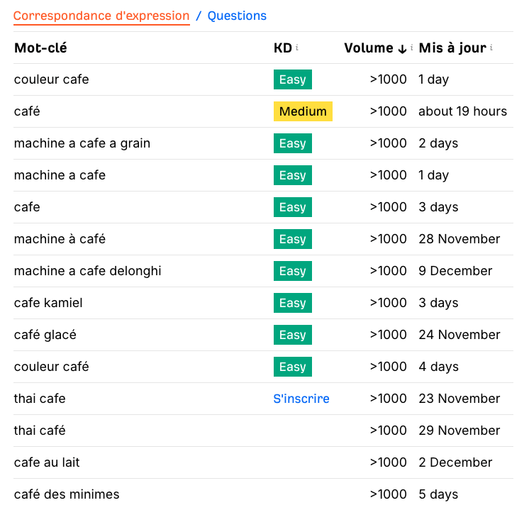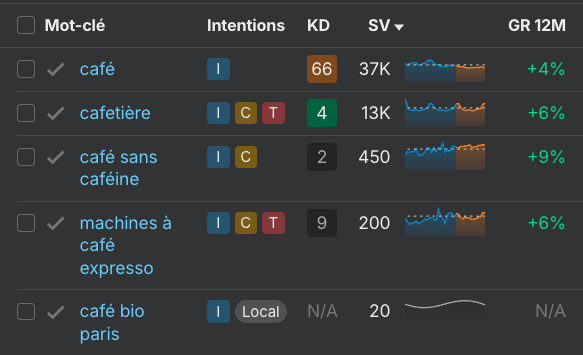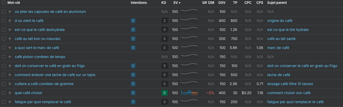 Par exemple, si vous vendez du café et du matériel pour le préparer, vos mots-clés de départ pourraient être :