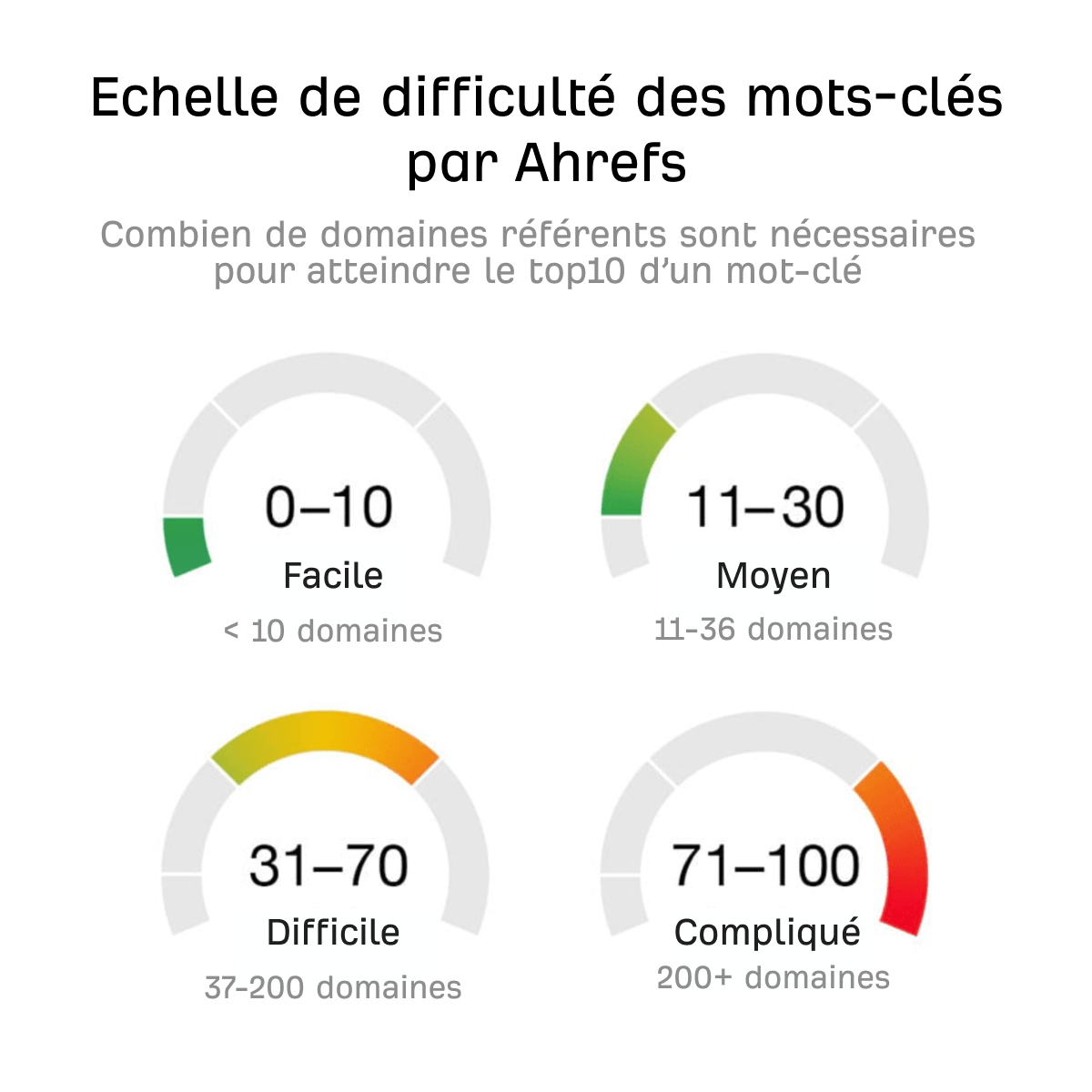 Tout cela complique le travail des créateurs d’outils SEO, qui tentent de résumer un concept aussi complexe que la difficulté de positionnement en un simple nombre à deux chiffres.
