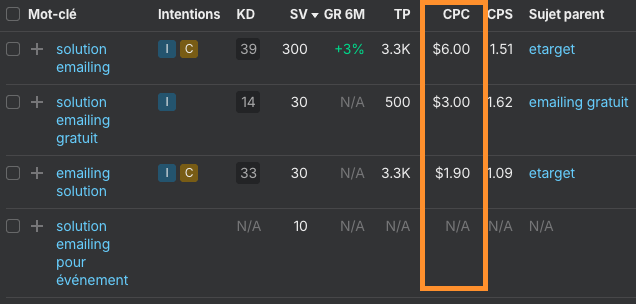 Par exemple, dans l’image ci-dessous, on voit que la requête “solution emailing” a un CPC assez élevé pour la France à 6$. Ça s’explique avec l’intention de recherche : les internautes semblent être à la recherche d’une solution à acheter.