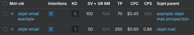 En revanche, c’est une tout autre histoire pour « Objet email exemple ». Il s’agit clairement d’une requête informationnelle, et les chances de vendre un logiciel d’envoi d’emails à ces internautes sont beaucoup plus faibles, d’où un CPC bien inférieur, à moins de 0,50$.
