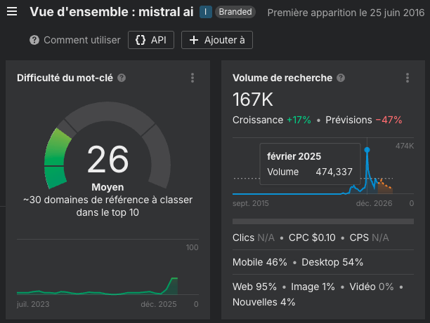 Par exemple, la requête “Mistral AI” affiche une moyenne annuelle de 167 000 recherches. Mais cette moyenne résulte de nombreux mois avec un volume de recherche avec des mois à plus de 470 000 recherches.