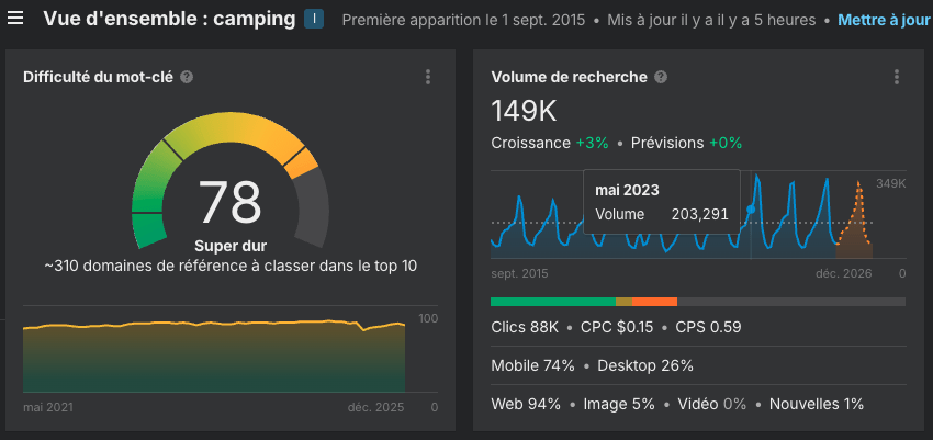Prenons également un mot-clé saisonnier comme « camping ». Le volume de recherche moyen affiché est de 149 000, mais cette moyenne provient de nombreux mois avec un volume bien plus faible (environ 50 000 la plupart du temps) et d’un seul mois avec un volume extrêmement élevé (jusqu’à 400 000 recherches).