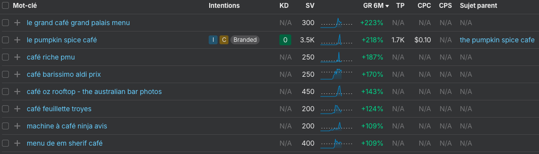 Vous pouvez facilement identifier ces mots-clés en tendance grâce à la métrique « Growth rate » (GR) pour taux de croissance dans Keywords Explorer. Il suffit d’ajouter vos mots-clés et de trier la colonne GR pour repérer les sujets en forte progression (comme « pumpkin spice café ») ou ceux qui perdent de l’intérêt en inversant le filtre.