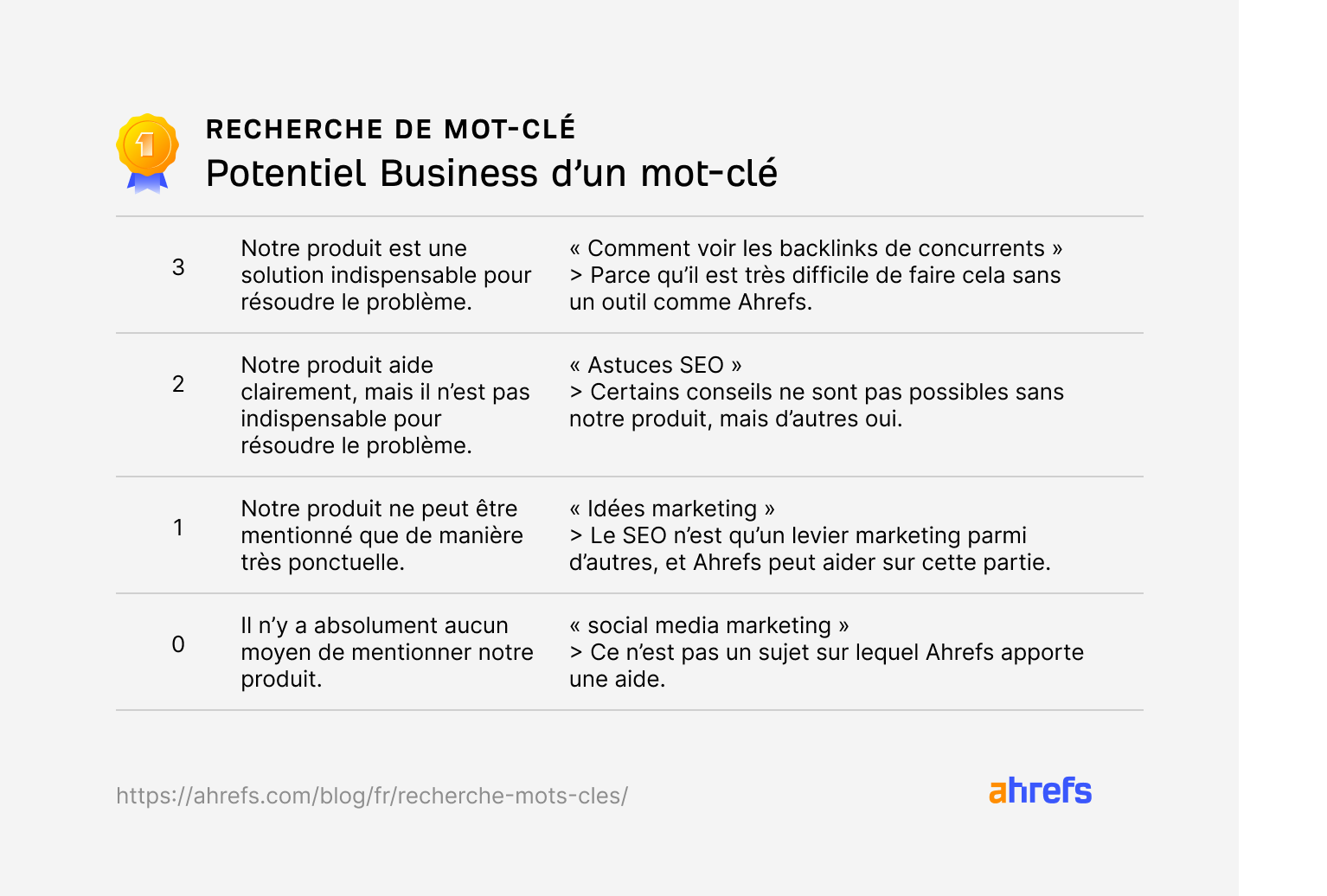 Nous l’appelons le « business potential ». Il s’agit d’un score simple, allant de 0 à 3, qui indique à quel point il est facile de pitcher un produit ou un service en traitant un mot-clé donné.