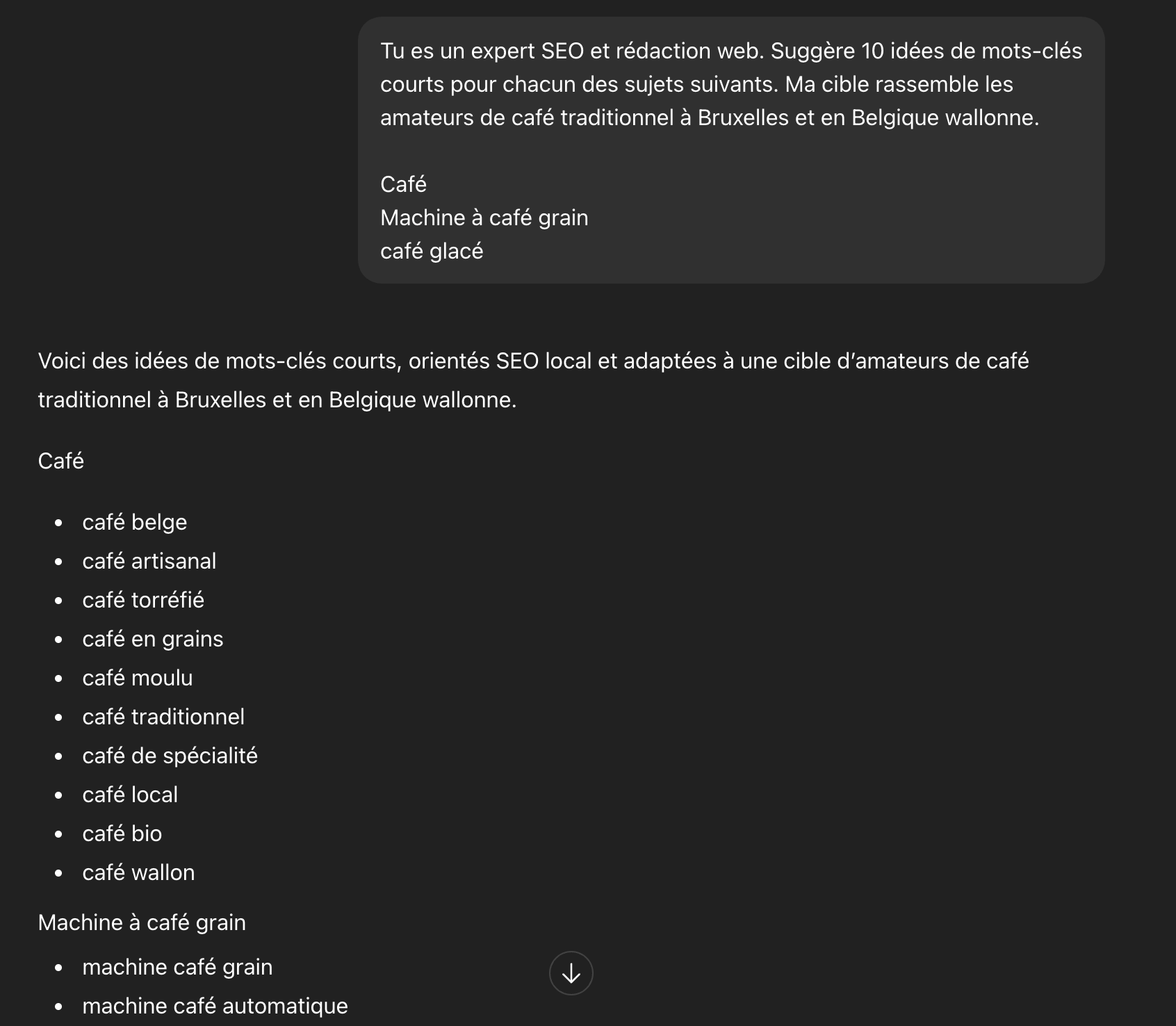 ChatGPT peut aussi être utile. Il suffit de coller vos mots-clés de départ avec une consigne du type : « Tu es un expert SEO et rédaction web. Suggère 10 idées de mots-clés courts pour chacun des sujets suivants. Ma cible est [description de la cible] ».