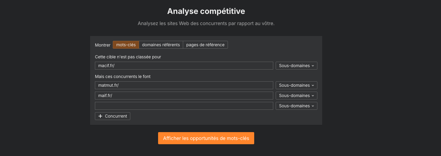 Pourquoi s’arrêter à votre propre site ? Vous pouvez aussi analyser les mots-clés sur lesquels se positionnent vos concurrents.