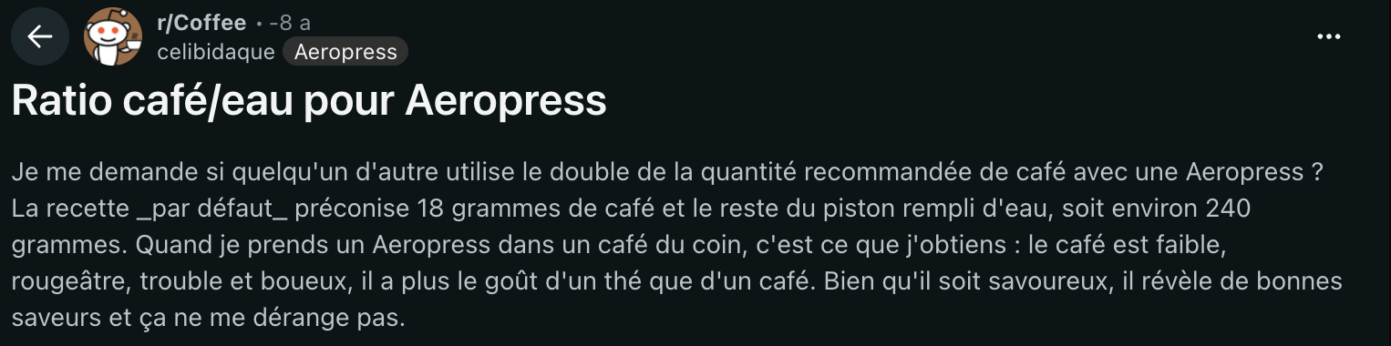 Vous pouvez y parvenir en allant là où votre audience cible passe du temps (forums spécialisés, groupes, sites de questions/réponses…) et en analysant leurs discussions. Par exemple, voici un fil trouvé sur le subreddit /r/coffee :