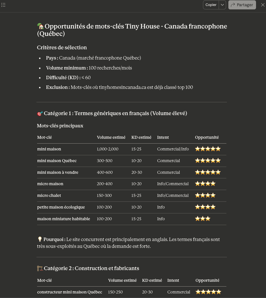 Vous pouvez alors décider immédiatement : est-ce un mot-clé pertinent à cibler ? Quel angle les concurrents n’exploitent-ils pas ? Faut-il plutôt mettre à jour une page existante ?