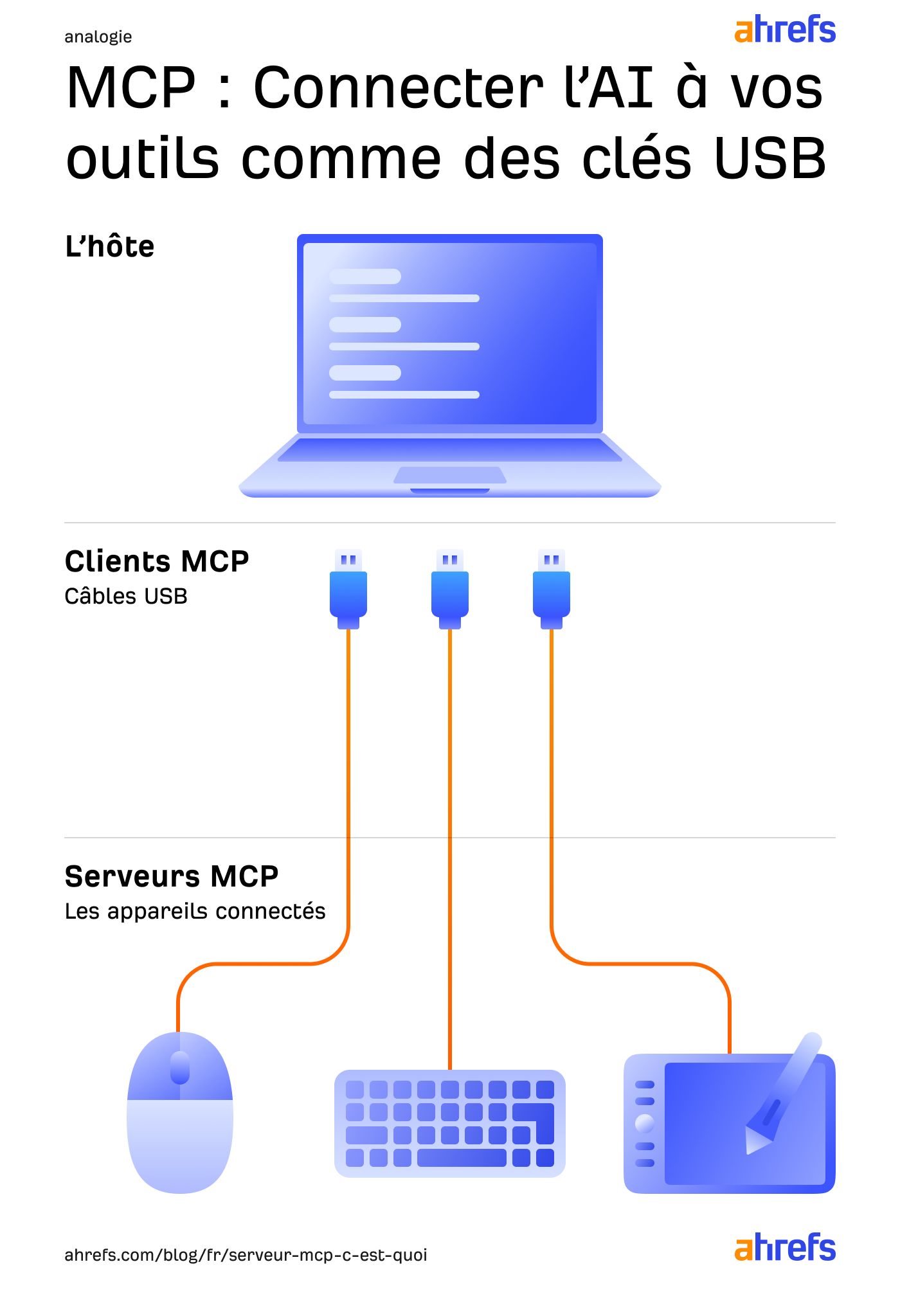 Un programme qui expose des éléments utiles à l’IA, comme des fonctions qu’elle peut appeler (par exemple « donne moi des positionnements des mots clés » ou « crée une tâche dans Asana »), des données ou ressources qu’elle peut lire (comme vos fichiers Google Drive ou les enregistrements de votre CRM), ainsi que des prompts pour guider l’IA.