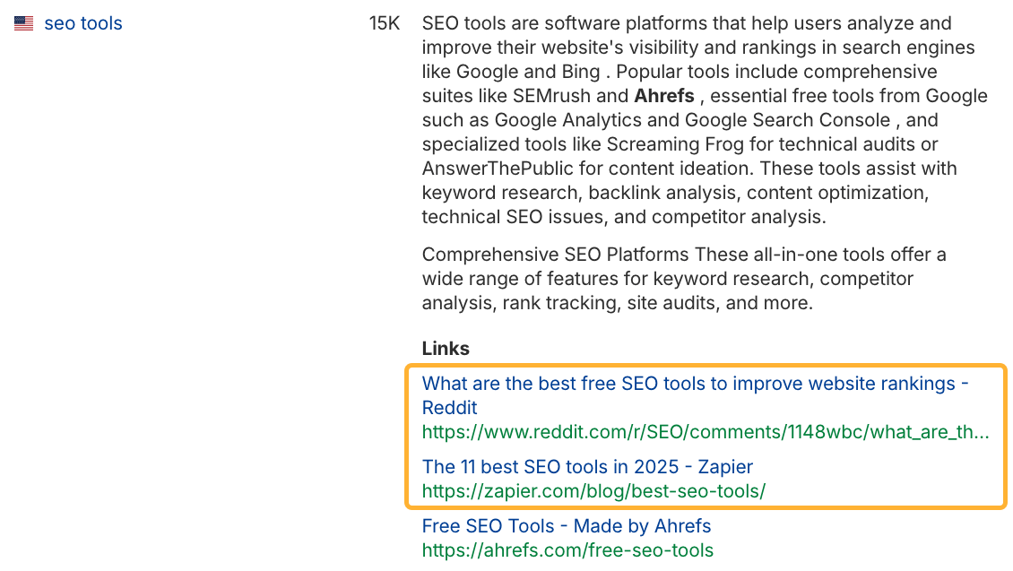 Par exemple, dans les Aperçus IA, Zapier, YouTube et Reddit sont cités plus fréquemment pour les requêtes concernant Ahrefs que notre propre site web :