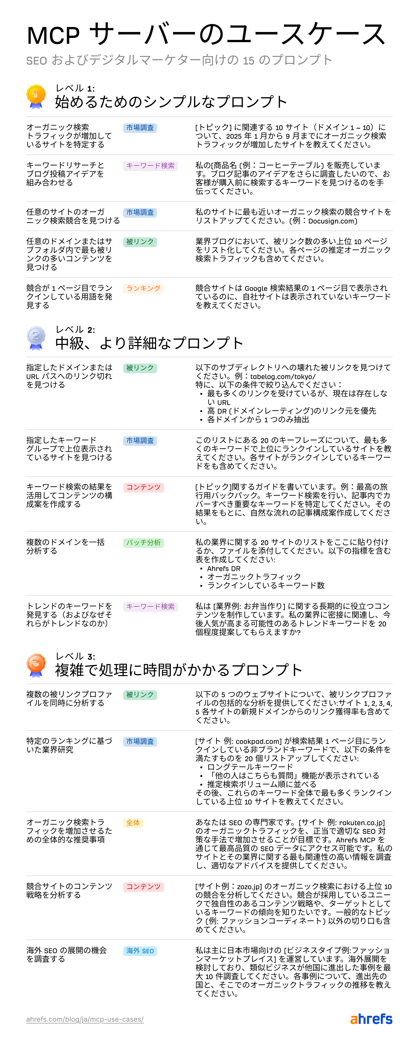プロンプトに「Ahrefs MCP サーバーを使用して、… についての上位ランキングブログをリストアップしてください」のように含めると、他でもない Ahrefs から直接データが収集されます。