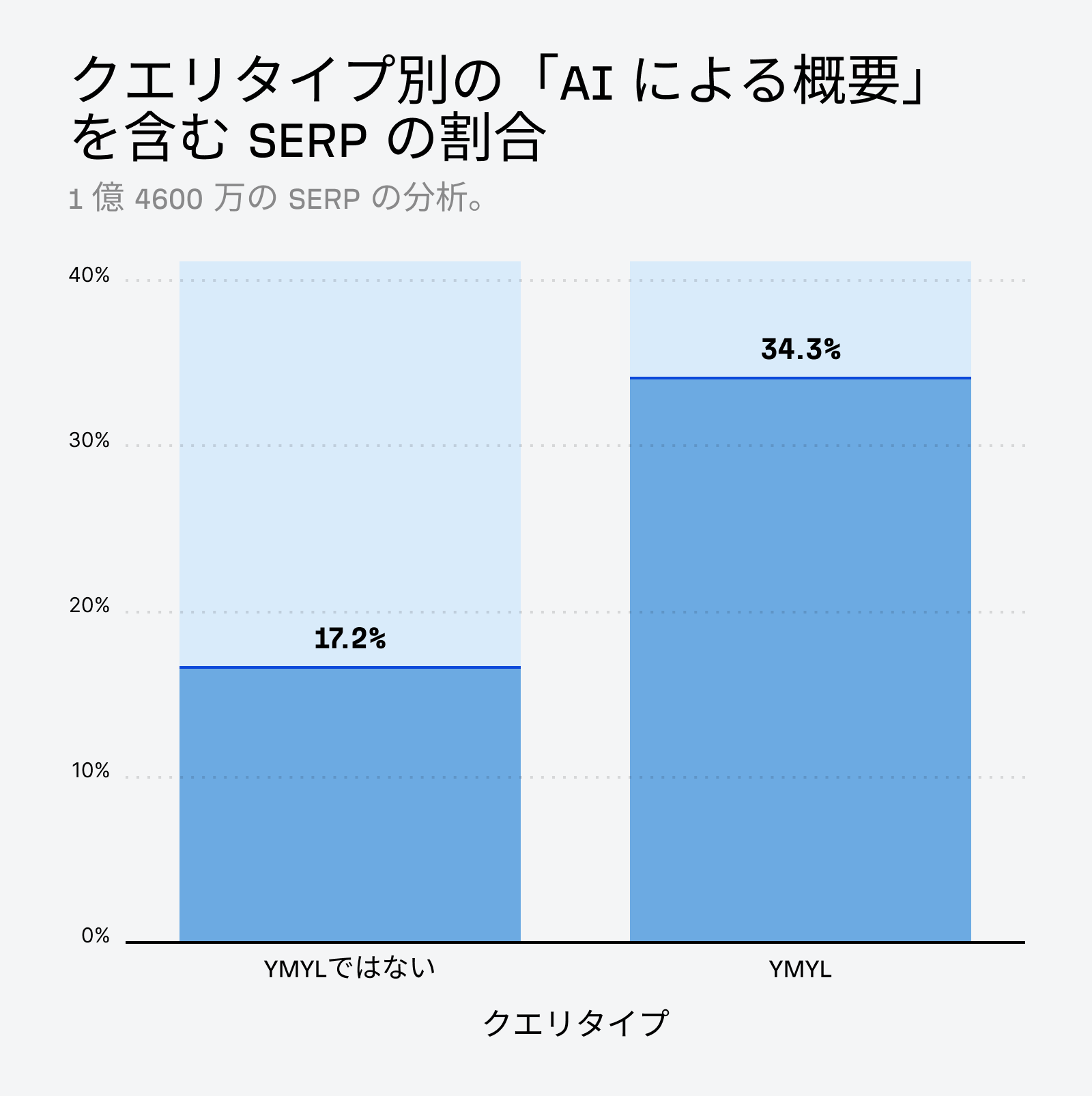 AI Overviews が表示されるキーワードのうち、約 3 割(32.3%)は YMYL(Your Money or Your Life:お金や人生に関わる領域)クエリとして分類されています。