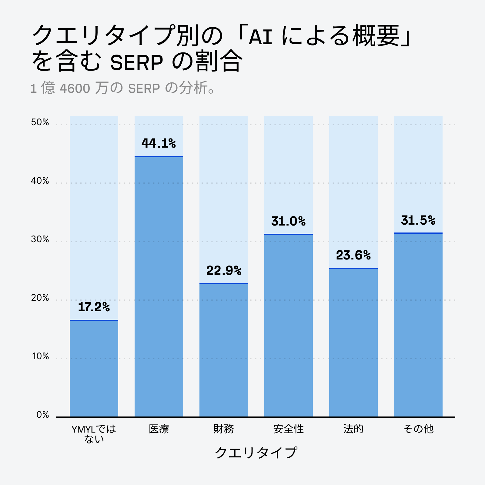 すべての YMYL カテゴリ(医療、金融、安全、法律、その他)で、AI Overviews の表示率は全体より高い傾向が見られます。