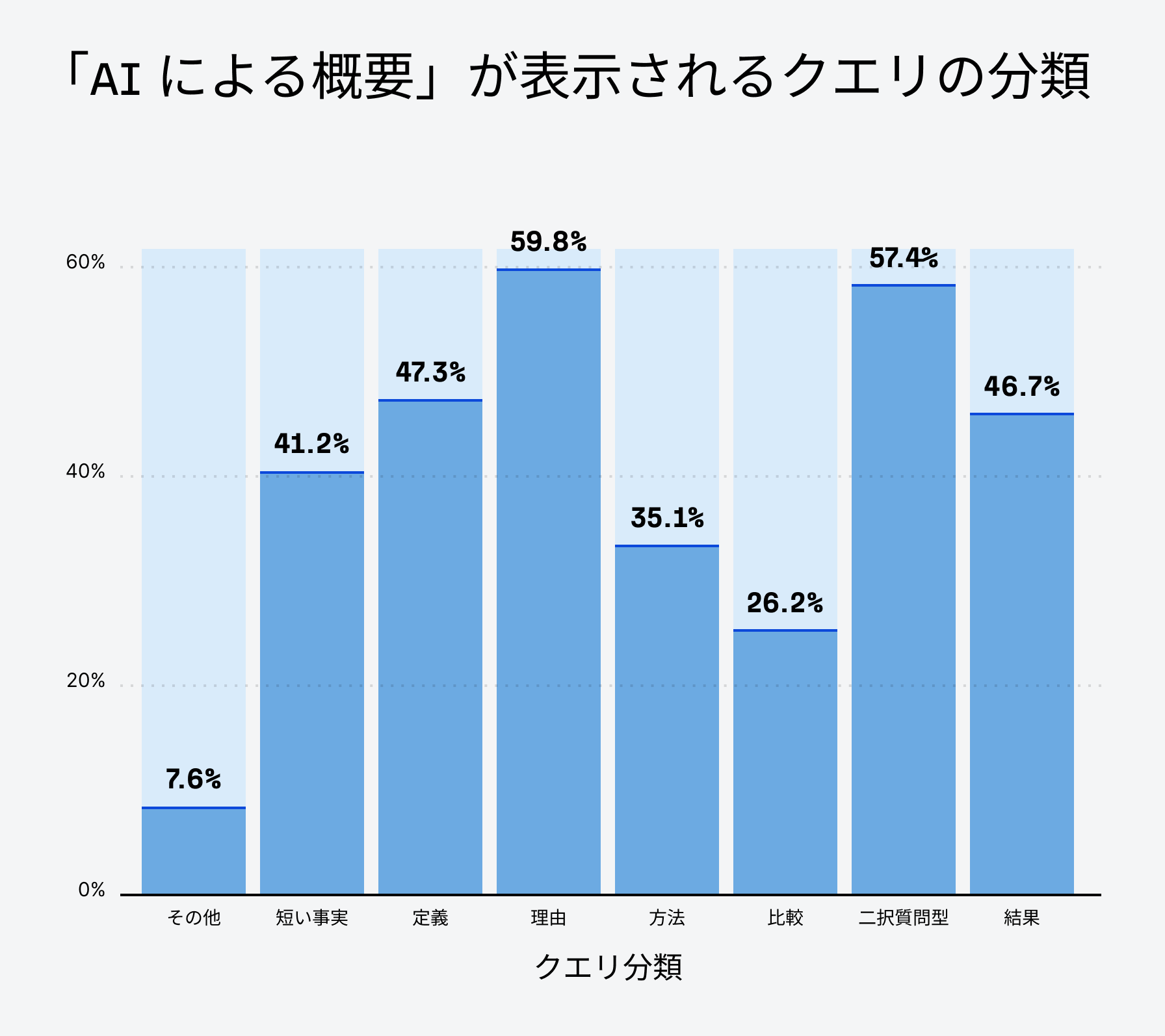 これらのカテゴリのうち、「その他」を除くすべてが平均よりも AI Overviews を表示しやすい傾向にあります。とりわけ理由系クエリは突出しており、59.8% で AI Overviews が表示されました。これは今回の分析で最も高い割合です。