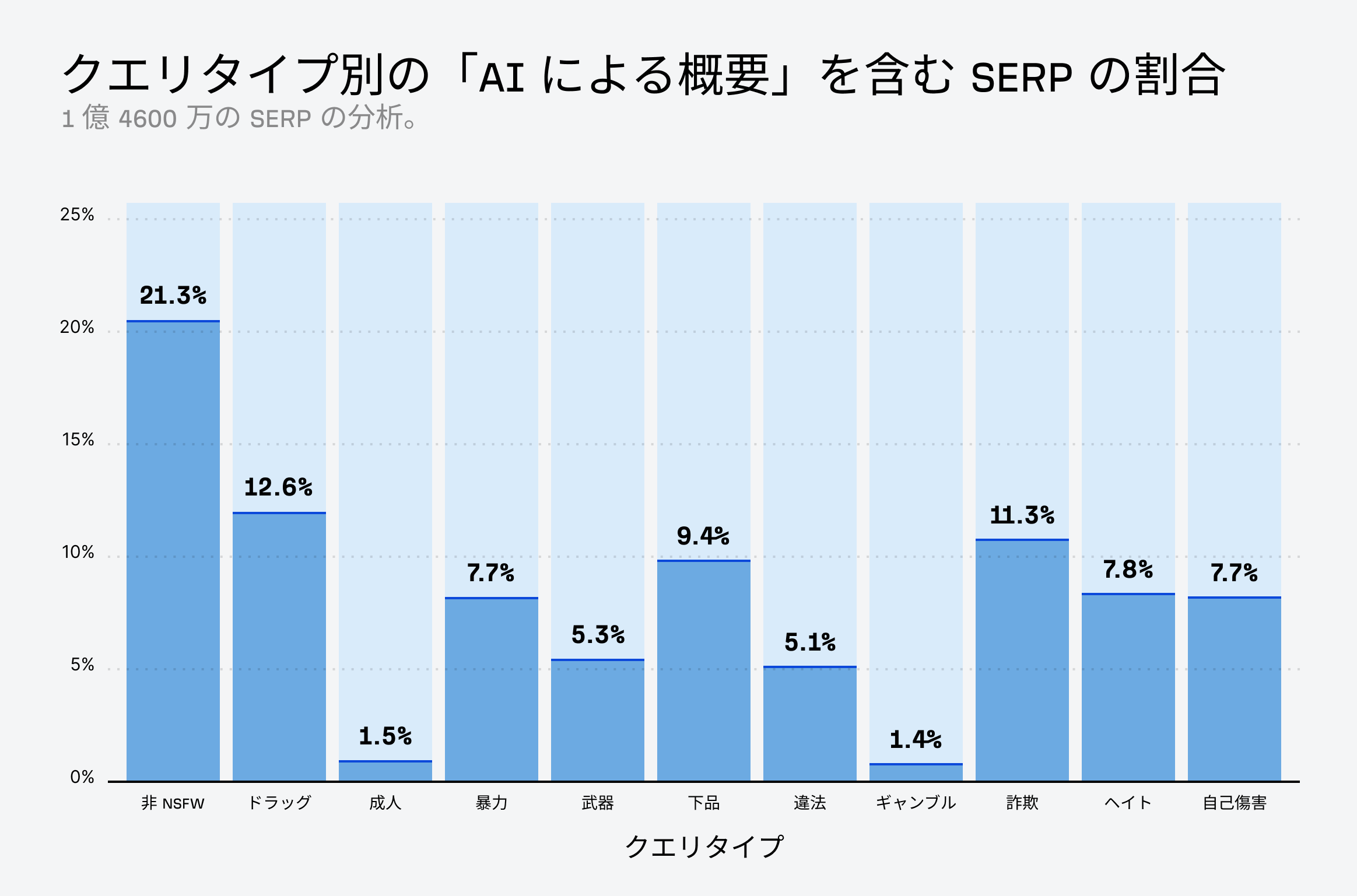 全体の AI Overviews 表示率である 20.5% と比べると、NSFW に分類されるすべてのカテゴリで AI Overviews の発生率が大幅に低くなっています。NSFW の中では、薬物関連クエリが 12.6%、詐欺関連のクエリが 11.3% と最も高いものの、 いずれも基準値を大きく下回っています。