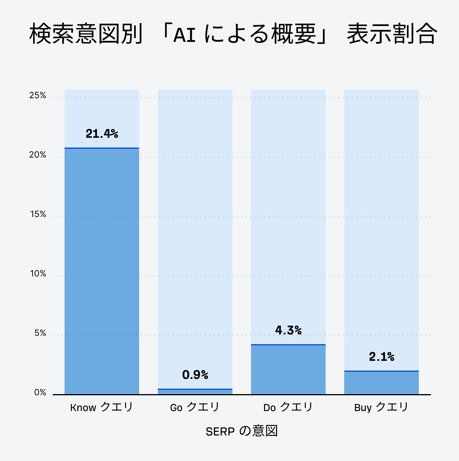 - AI Overviews の 99.9% は「情報収集型(Informational)」の検索意図(インテント)を持つキーワードで表示される。