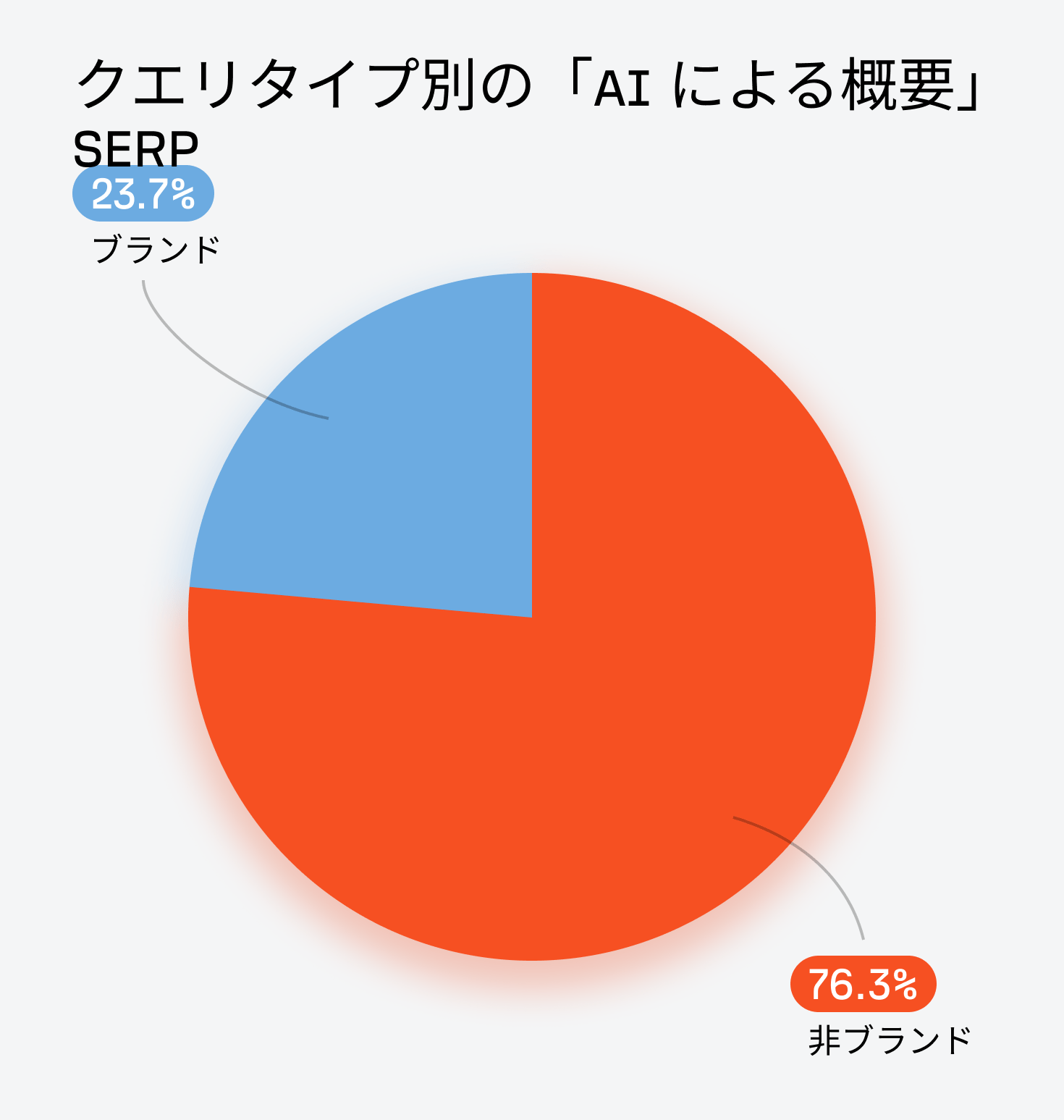 AI Overviews が表示されるキーワードのうち、 76.3% は「非ブランド系の検索クエリ(例:SEO ツール)」で、残りの 23.7% は「ブランド系の検索クエリ(例:Ahrefs)」に分類されています。