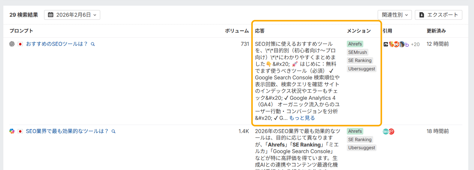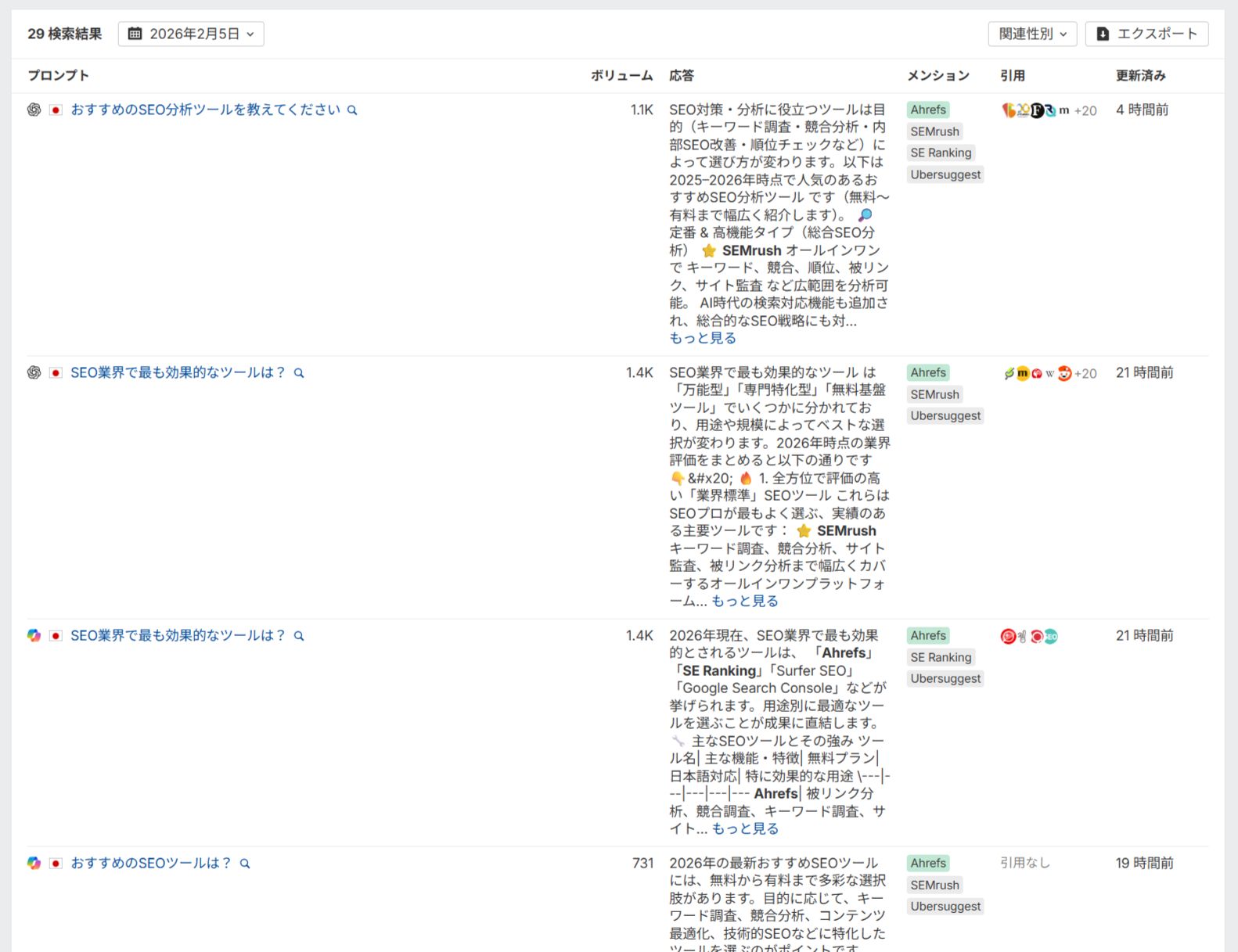 例えば、「SEO 業界で最も効果的なツールは?」といった質問は、業界内での「言及量」を確認するのに役立ちます。さらには、AI による回答の中で専門性が同時に語られているかを分析することで、文脈の質の評価も可能となります。