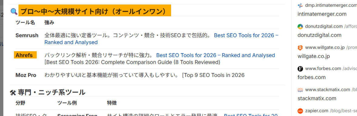 今回の調査では、Ahrefs と SEM­rush の 2 社が優勢という結果が出ました。ここで大切なのは、名前が出た数よりも「AI がどのような文脈で紹介しているか」という中身の部分です。まずは検索結果の応答をじっくり眺めて、「自社のイメージは狙い通りか?」とフラットな視点で観察してみると良いでしょう。そうすると、客観的なブランド評価の実態が見えてきます。